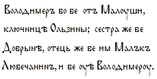 "Володимеръ бо бе отъ Малуши, ключнице Ользины; сестра же бе Добрыне, отець же бе имя Малъкъ Любечанинъ, и бе уе Володимеру." (ПОВЕ с. 68; цит. по ДИМП с. 80)